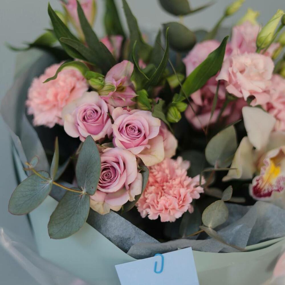 Альстромерия – 1 шт. Гвоздика – 2 шт. Лента атласная – 3 шт. орхидея – 1 шт. Упаковка дизайнерская – 1 шт. Пионовидная кустовая роза – 1 шт. эустома розовая махровая – 1 шт. Карточка для подписи – 1 шт. зелень эвкалипта – 3 шт.