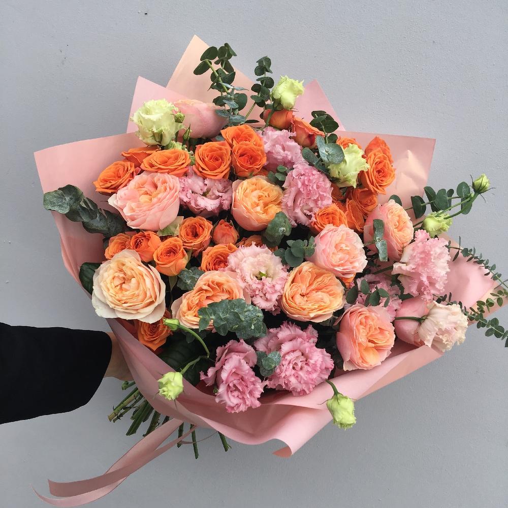 Роза пионовидная – 9 шт.Роза кустовая – 5 шт.Лизиантус – 9 шт.Эвкалипт – 9 шт.Упаковка – 3 шт.Лента атласная – 2 шт.