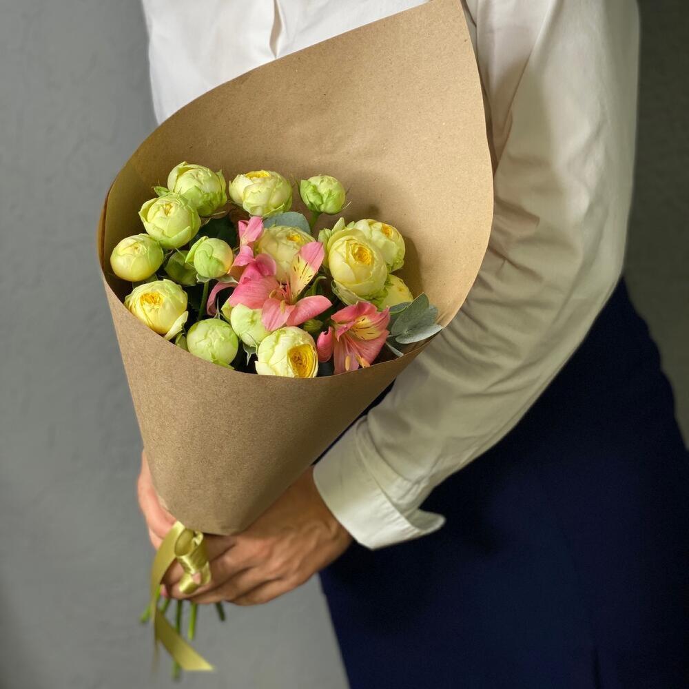 Роза пионовидная желтая – 5 шт. Альстромерия – 1 шт. Крафт – 1 шт. Открыточка с вашими пожеланиями – 1 шт. доставка – 1 шт.