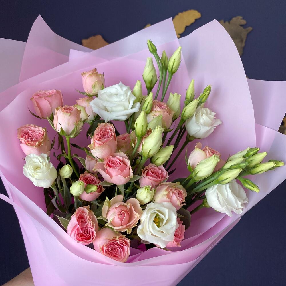 Авторский букет с кустовой розой и лизиантусом