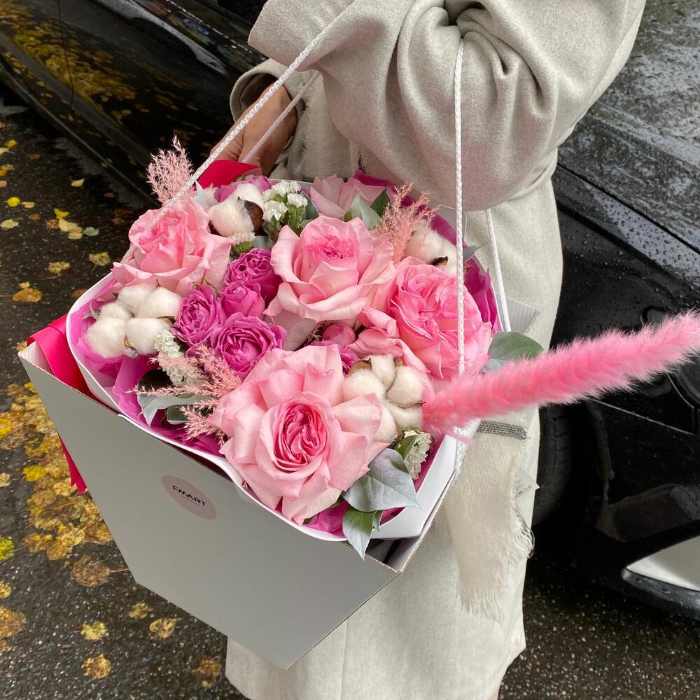 pink o’hara – 5 шт.камыш – 1 шт.Хлопок – 5 шт.Роза пионовидная кустовая – 3 шт.Упаковка – 4 шт.Салал – 5 шт.Статица – 2 шт.мискантус – 4 шт.
