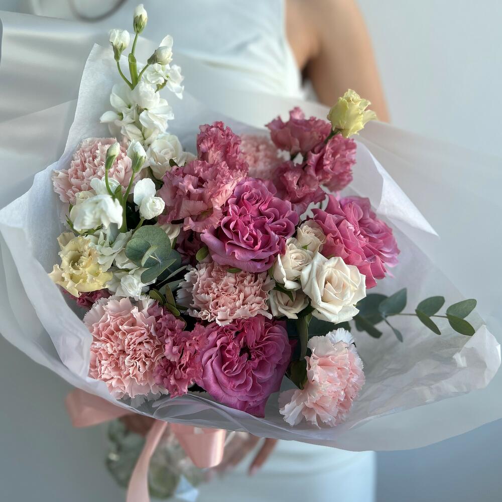 Маттиола – 2 шт.Эвкалипт – 1 шт.Кустовая роза – 3 шт.Гвоздика – 5 шт.Эустома – 1 шт.Пионовидная роза – 3 шт.