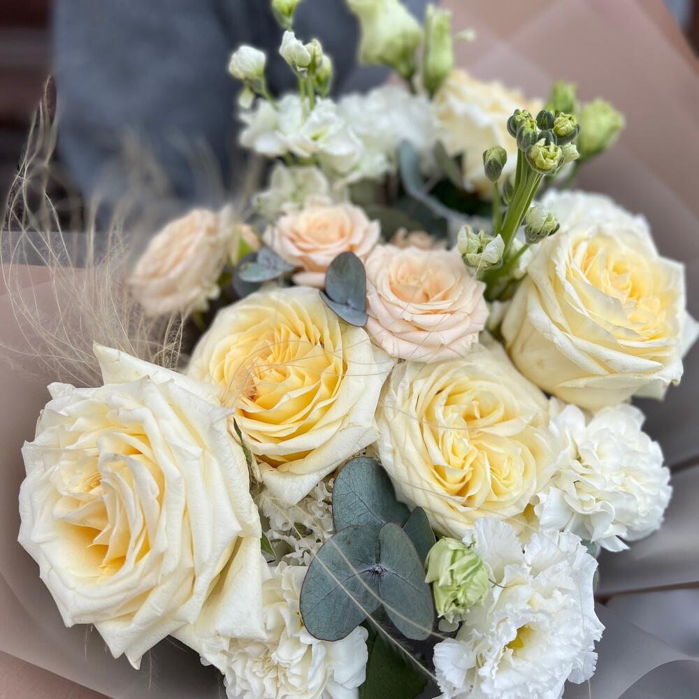 роза кэндллайт – 5 шт.Маттиола – 2 шт.Ковыль – 1 шт.Диантус – 3 шт.эустома махровая белая – 1 шт.роза кустовая таня – 1 шт.Эвкалипт – 1 шт.Пленка матовая – 7 шт.Лента атласная – 2 шт.