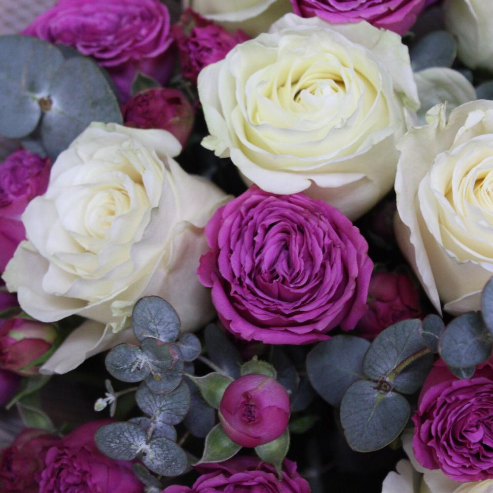 Роза Эквадор Премиум – 7 шт.роза пионовидная кустовая классик сенсейшн – 5 шт.Эвкалипт Baby Blue – 5 шт.Пленка матовая – 4 шт.Лента атласная – 2 шт.