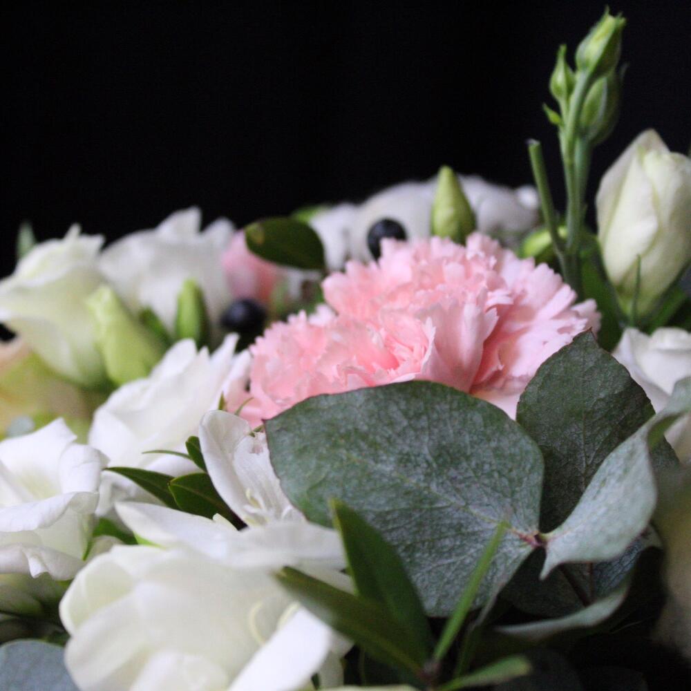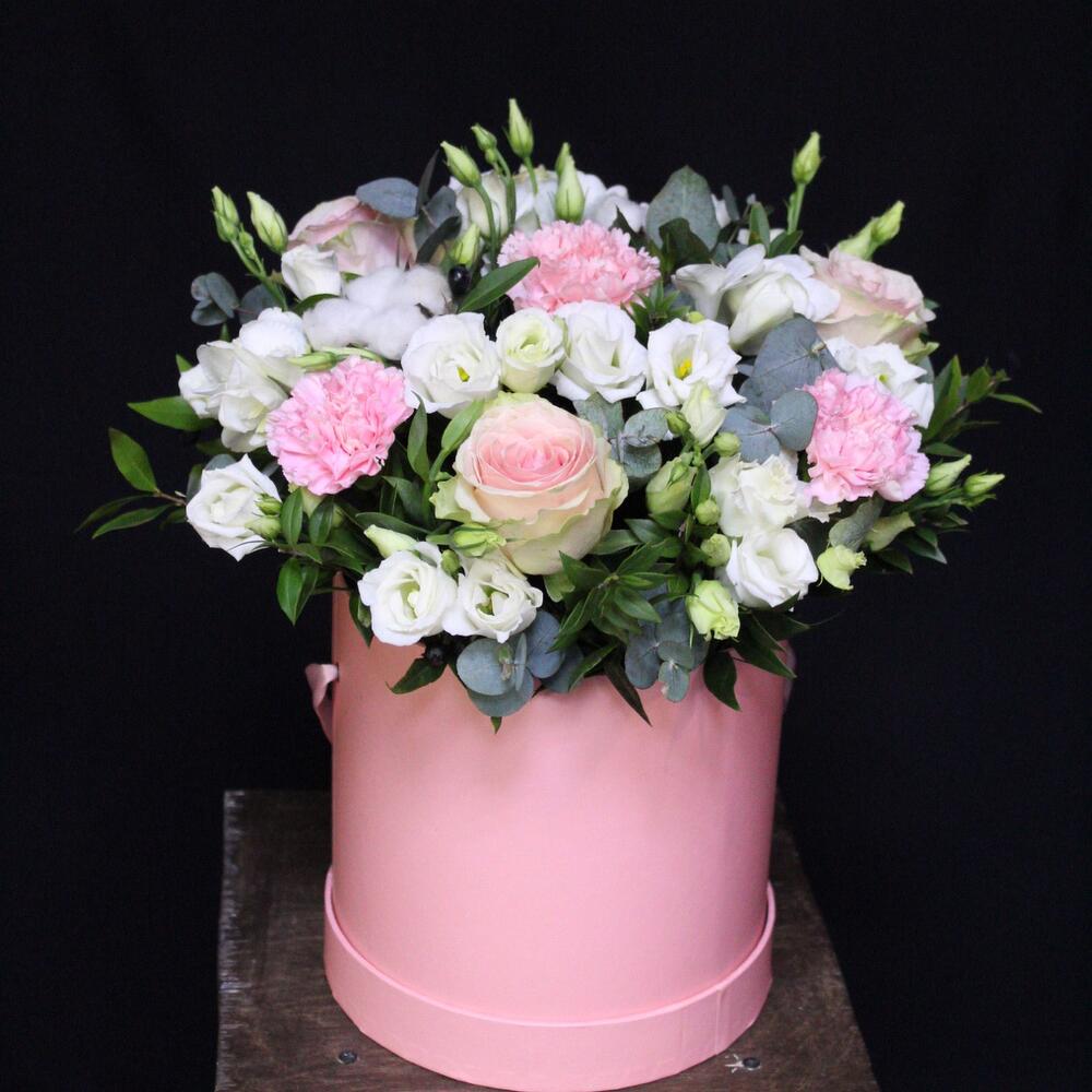 Роза Эквадор – 3 шт.Эустома – 5 шт.Хлопок натуральный – 2 шт.Фрезия белая – 3 шт.Диантус – 4 шт.Эвкалипт – 2 шт.Фисташка – 2 шт.Коробка шляпная – 1 шт.Оазис – 1 шт.