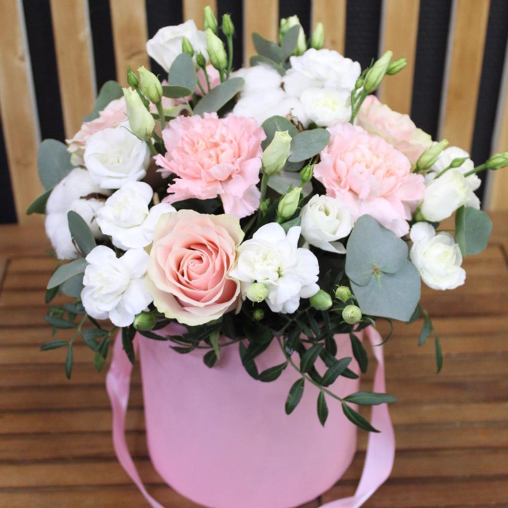 Роза Эквадор – 3 шт.Диантус – 4 шт.лизиантус розита вайт – 2 шт.Эвкалипт – 1 шт.Фисташка – 1 шт.Шляпная коробка – 1 шт.Оазис флористический – 1 шт.Диантус кустовой – 2 шт.Хлопок – 3 шт.