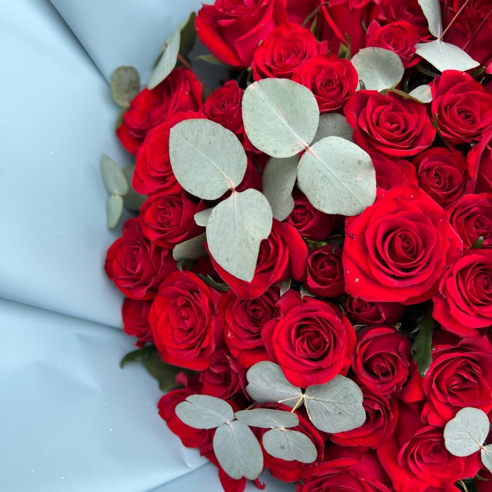 Роза Эквадор 60 см – 101 шт.Дизайнерская упаковка – 10 шт.Лента атласная – 2 шт.Эвкалипт цинерея – 5 шт.