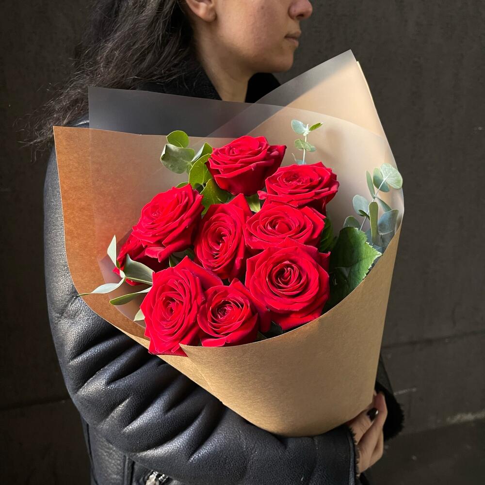 Букет 17: 9 красных роз с эвкалиптом