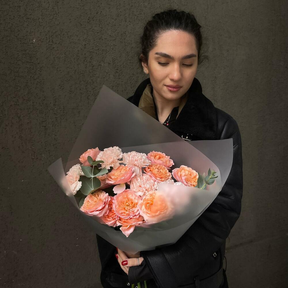 Эвкалипт – 2 шт.Диантус – 5 шт.Роза кустовая пионовидная – 3 шт.Упаковка дизайнерская – 1 шт.