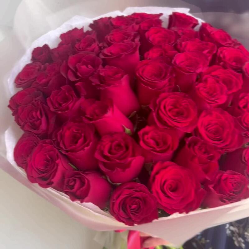 Лента атласная – 1 шт.Матовая пленка – 3 шт.Тишью белое – 2 шт.роза 40 см (кения) – 51 шт.