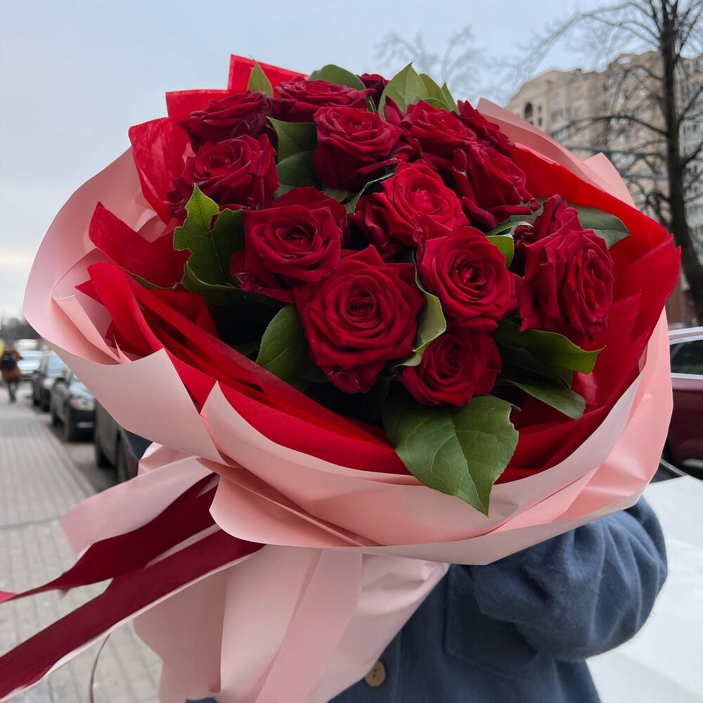 Салал – 8 шт.Лента атласная – 6 шт.Пленка – 9 шт.Роза красная россия 50 см – 15 шт.