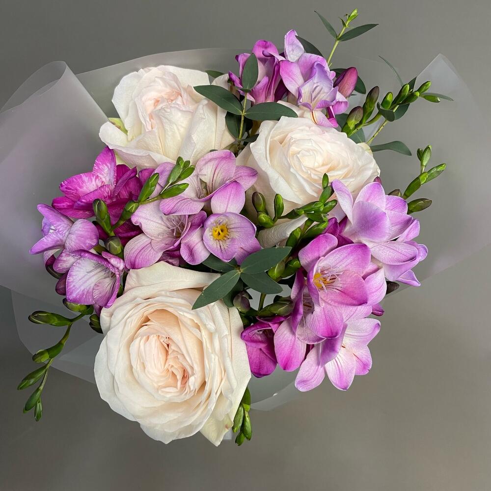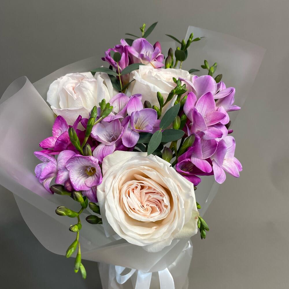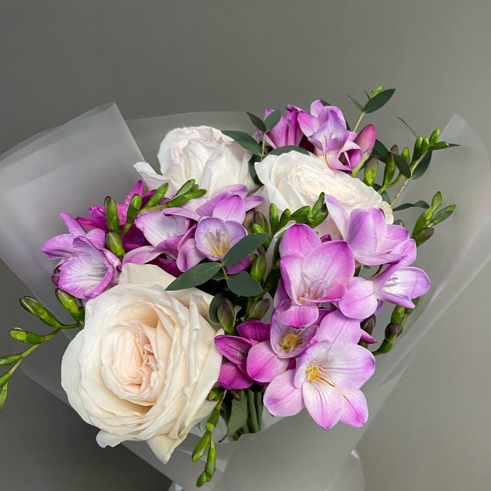 Фрезия – 4 шт.Лента атласная – 1 шт.Роза пионовидная – 3 шт.Упаковка дизайнерская – 1 шт.