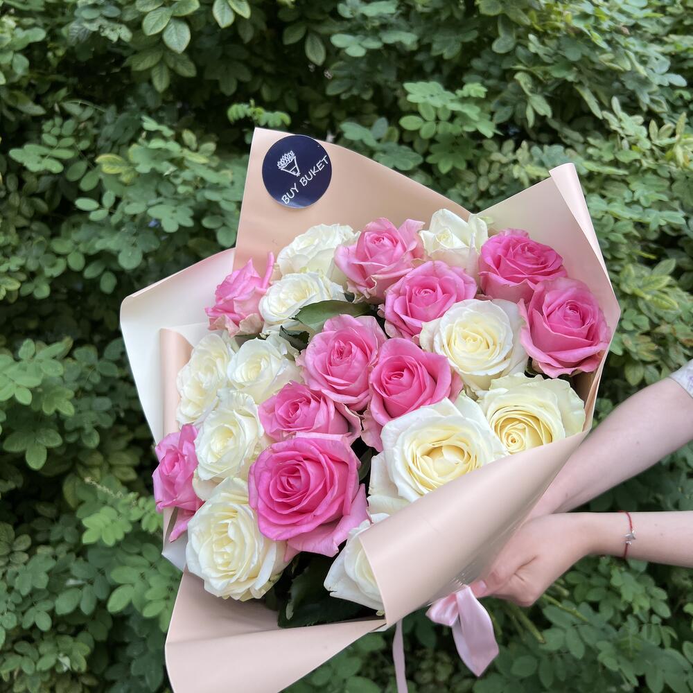 Букет из 21 белой и розовой розы 50 см