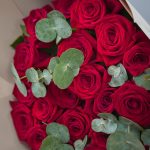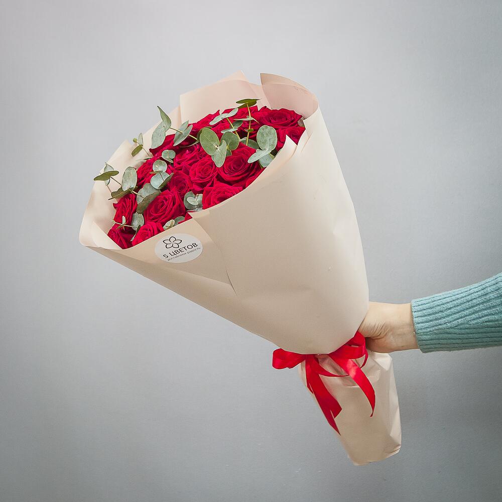 Роза красная – 25 шт.Эвкалипт – 3 шт.