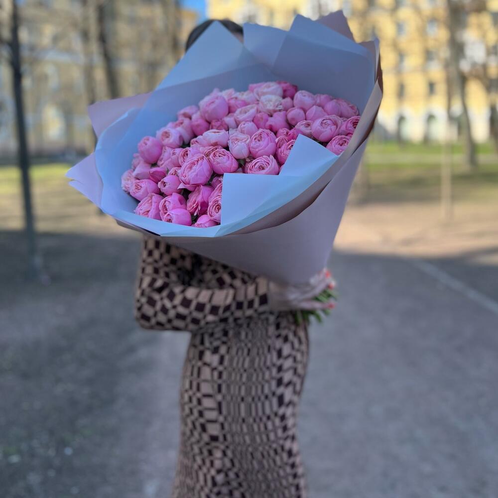 Лента атласная – 1 шт.Упаковка дизайнерская – 4 шт.Пионовидная кустовая роза – 25 шт.