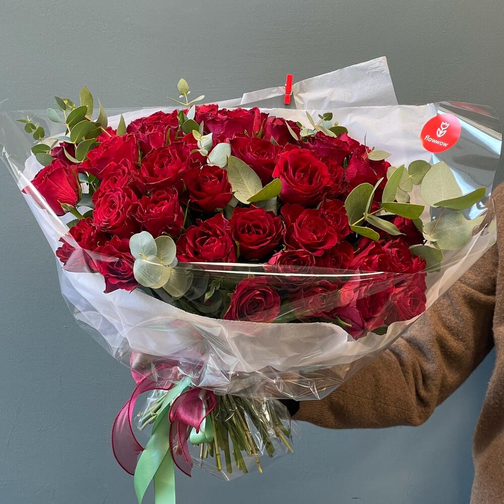 Эвкалипт – 3 шт.Роза – 51 шт.Упаковка дизайнерская – 1 шт.