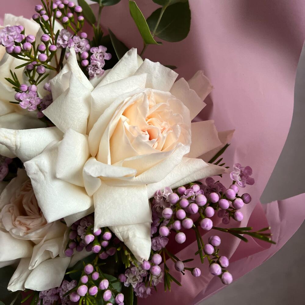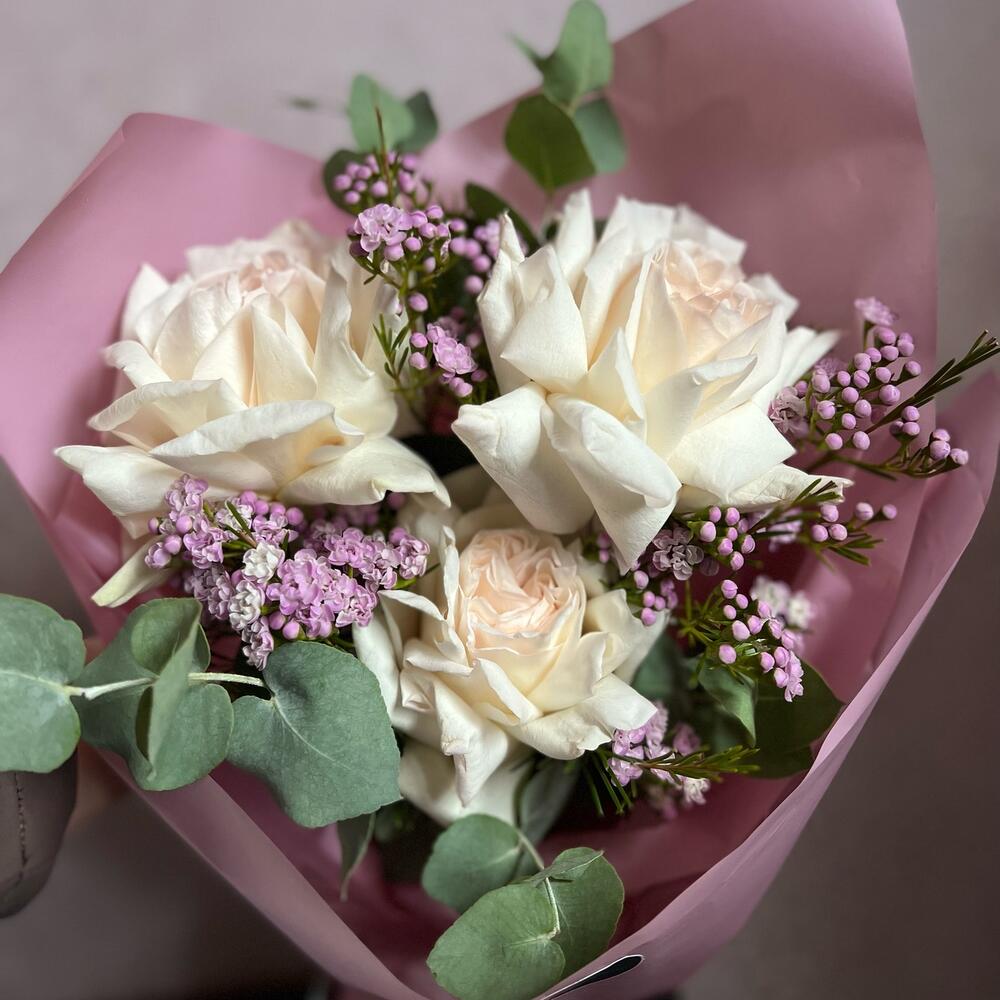 пионовидная роза white o’hara – 3 шт.Хамелациум – 2 шт.Эвкалипт – 3 шт.декоративная упаковка – 1 шт.Атласная лента – 1 шт.