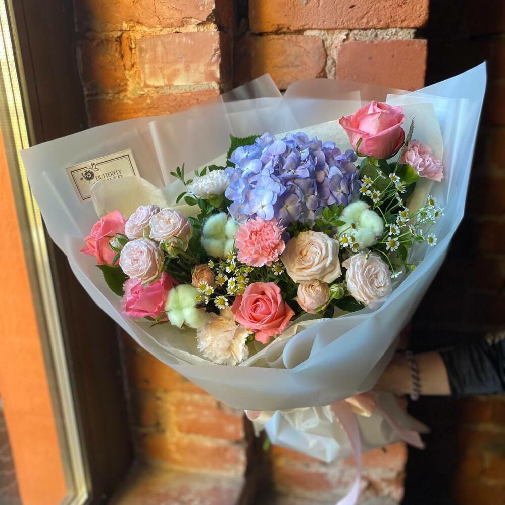 Букет из гортензии, кустовых роз, диантусов, роз, хлопка, матрикарии и самшита в стильной упаковке “Рейнис”