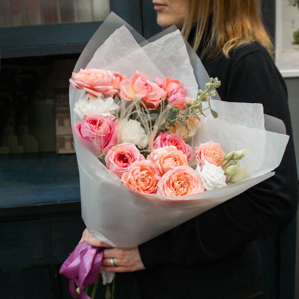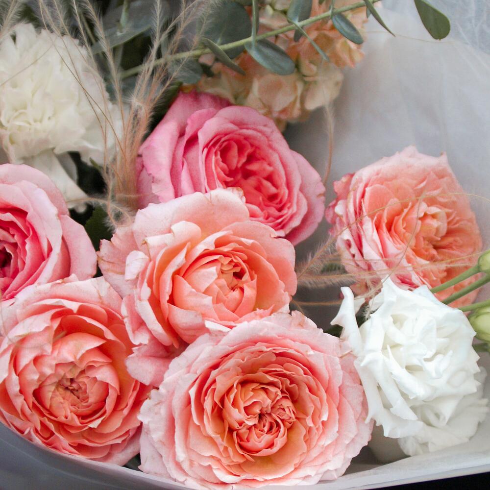 Пионовидная роза – 3 шт.Кустовая пионовидная роза джульетта – 2 шт.Эустома – 1 шт.Диантус – 2 шт.Маттиола – 1 шт.Ковыль – 2 шт.Эвкалипт – 2 шт.Тишью – 2 шт.Матовая пленка – 2 шт.Атласная лента – 2 шт.
