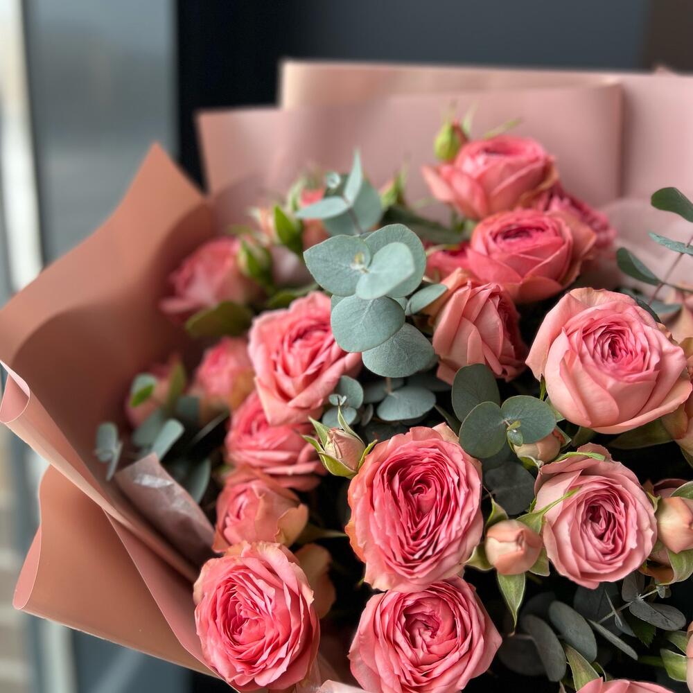 Кустовая пионовидная роза – 5 шт.Эвкалипт – 3 шт.декоративная упаковка – 1 шт.Атласная лента – 1 шт.