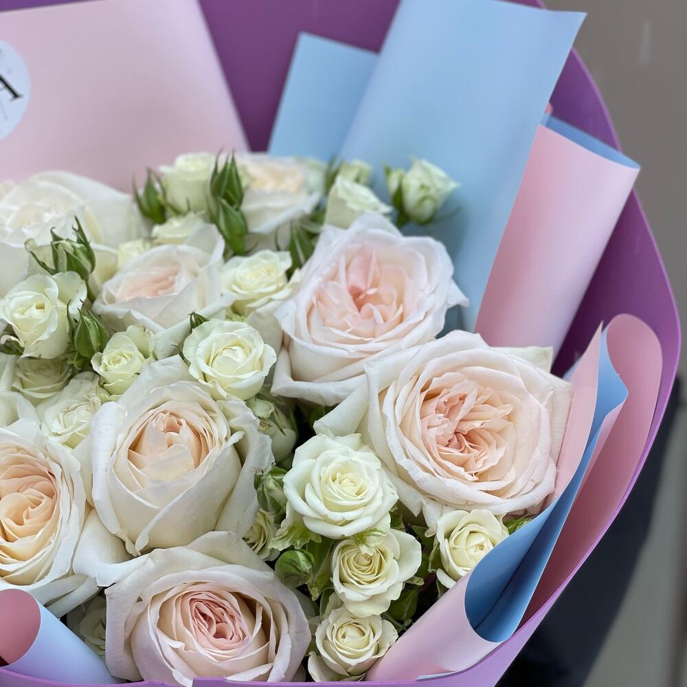 Роза кустовая – 4 шт.Упаковка дизайнерская – 4 шт.лента фирменная – 2 шт.Фоамиран (упаковка) – 1 шт.white o’hara пионовидная роза – 9 шт.