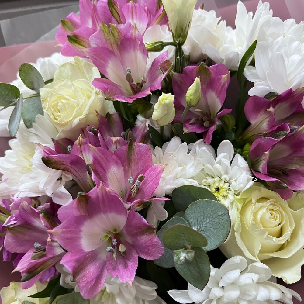 Категорий: Альстромерии, Кустовые розы, Лизиантусы, Розы, Хризантемы