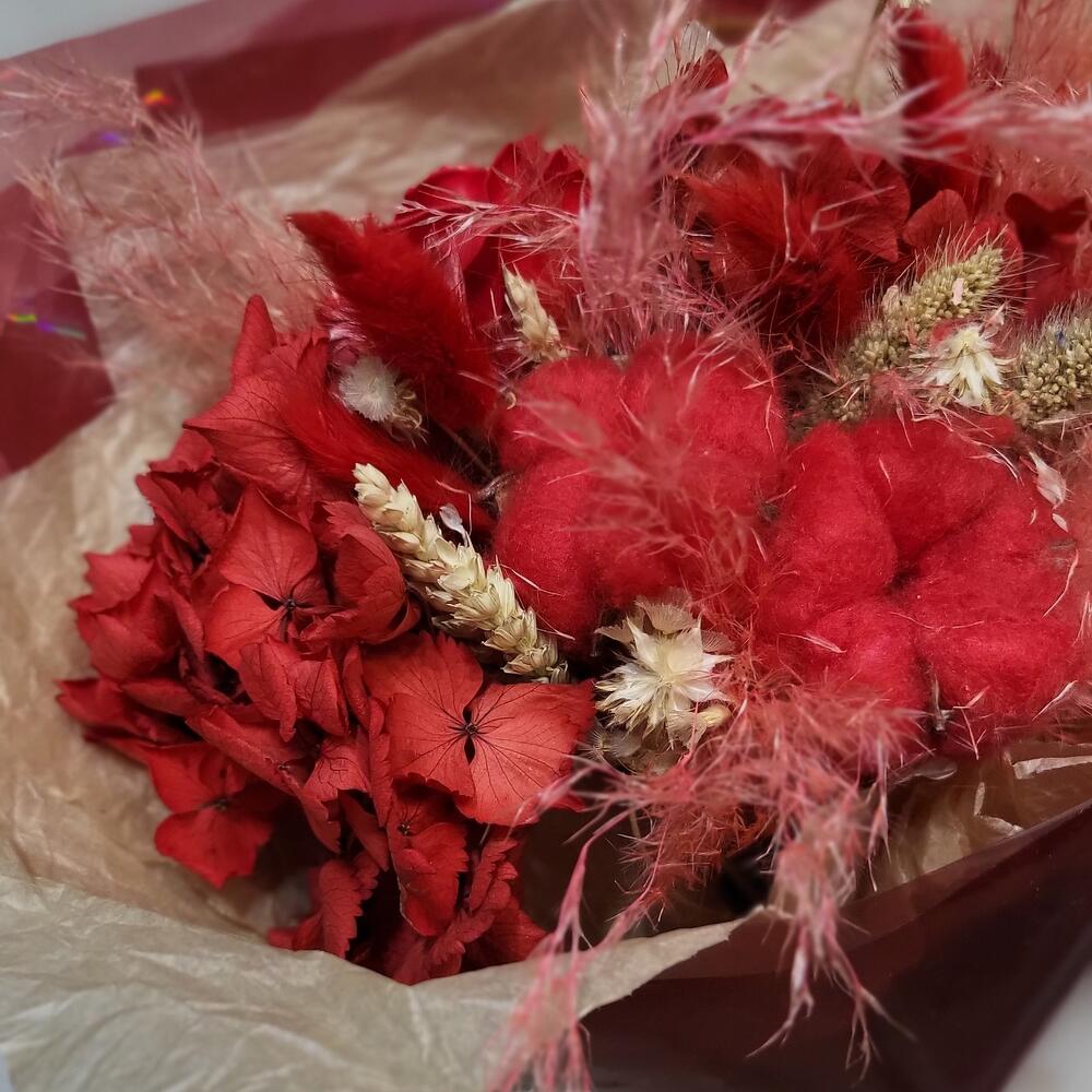 Хлопок – 2 шт.Гортензия – 2 шт.роза мыльная – 1 шт.Лагурус (сухоцвет) – 5 шт.Тритикале – 5 шт.кортадерия – 1 шт.