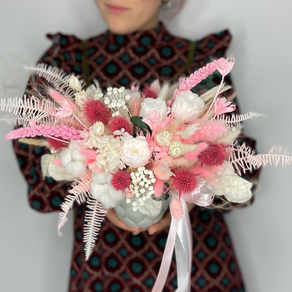 Эрингиум – 3 шт.роза пионовидная стабилизированная – 3 шт.Ковыль – 1 шт.Лагурус – 53 шт.Кашпо керамическое – 1 шт.Нигелла сухоцвет – 5 шт.Оазис флористический – 1 шт.Хлопок натуральный – 3 шт.Вейник – 2 шт.Эвкалипт стабилизированный – 3 шт.гортензия сухоцвет – 1 шт.фаларис сухоцвет – 23 шт.лист пальмы сухоцвет – 1 шт.камыш сухоцвет – 1 шт.сетария сухоцвет – 2 шт.пижма сухоцвет – 3 шт.Лента – 2 шт.