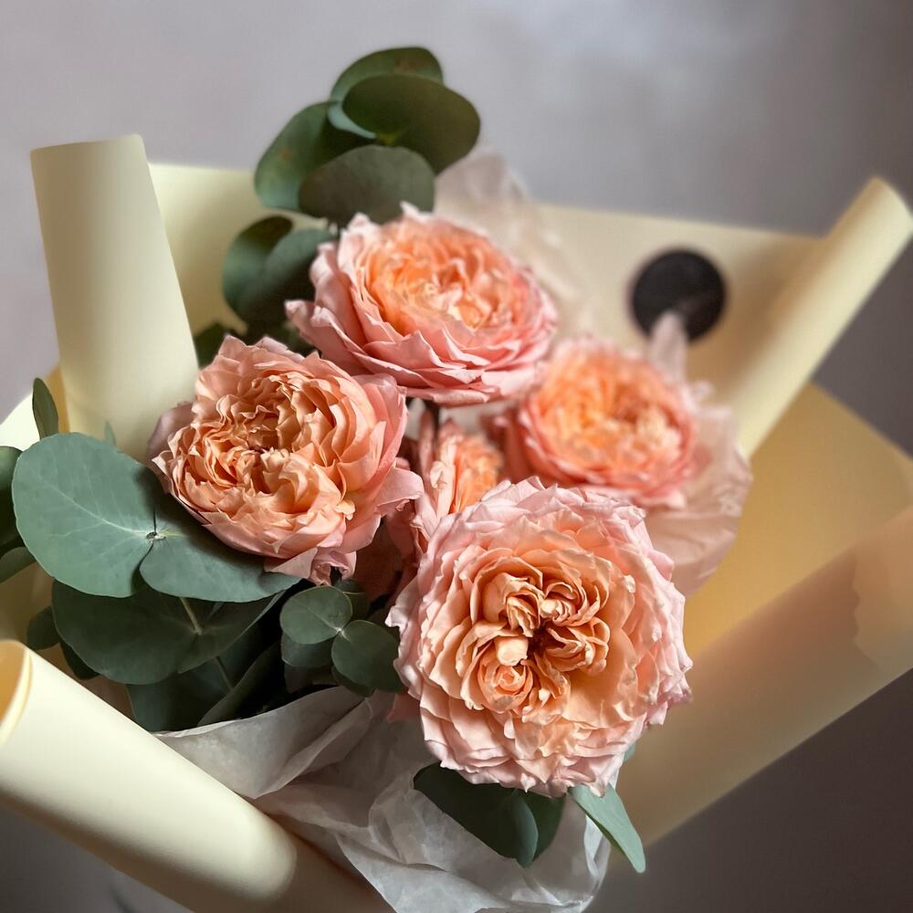 Кустовая роза – 1 шт.Эвкалипт – 3 шт.декоративная упаковка – 1 шт.Атласная лента – 1 шт.