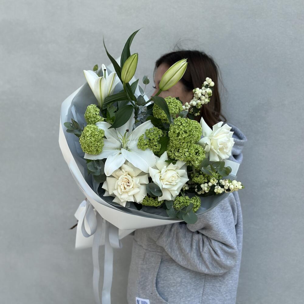 Лилия – 1 шт. Вибурнум – 4 шт. Роза – 3 шт. Симфорикарпус – 2 шт. Эвкалипт – 1 шт.