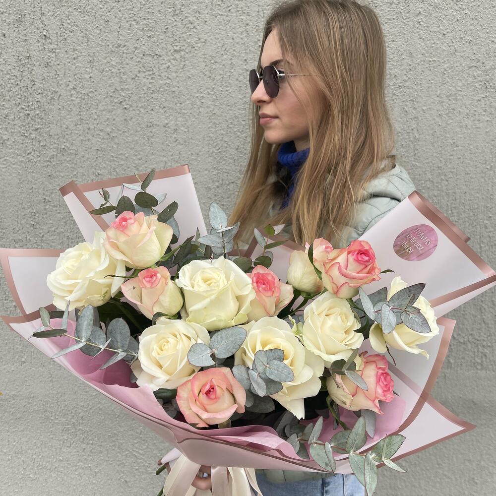 микс из роз – 13 шт. Упаковка – 1 шт. Атласная лента – 1 шт.