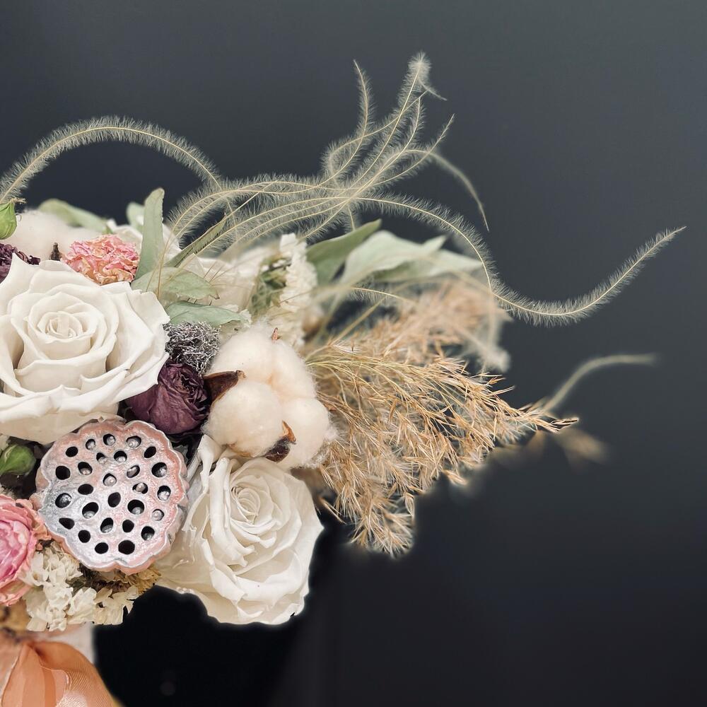 Роза стабилизированная – 6 шт.Роза сухоцвет – 15 шт.Хлопок (сухоцвет) – 6 шт.Эвкалипт сухоцвет – 7 шт.Статица – 11 шт.трахелиум сухоцвет – 3 шт.Лотос сухой – 1 шт.ковыль связка – 3 шт.Колоски – 31 шт.