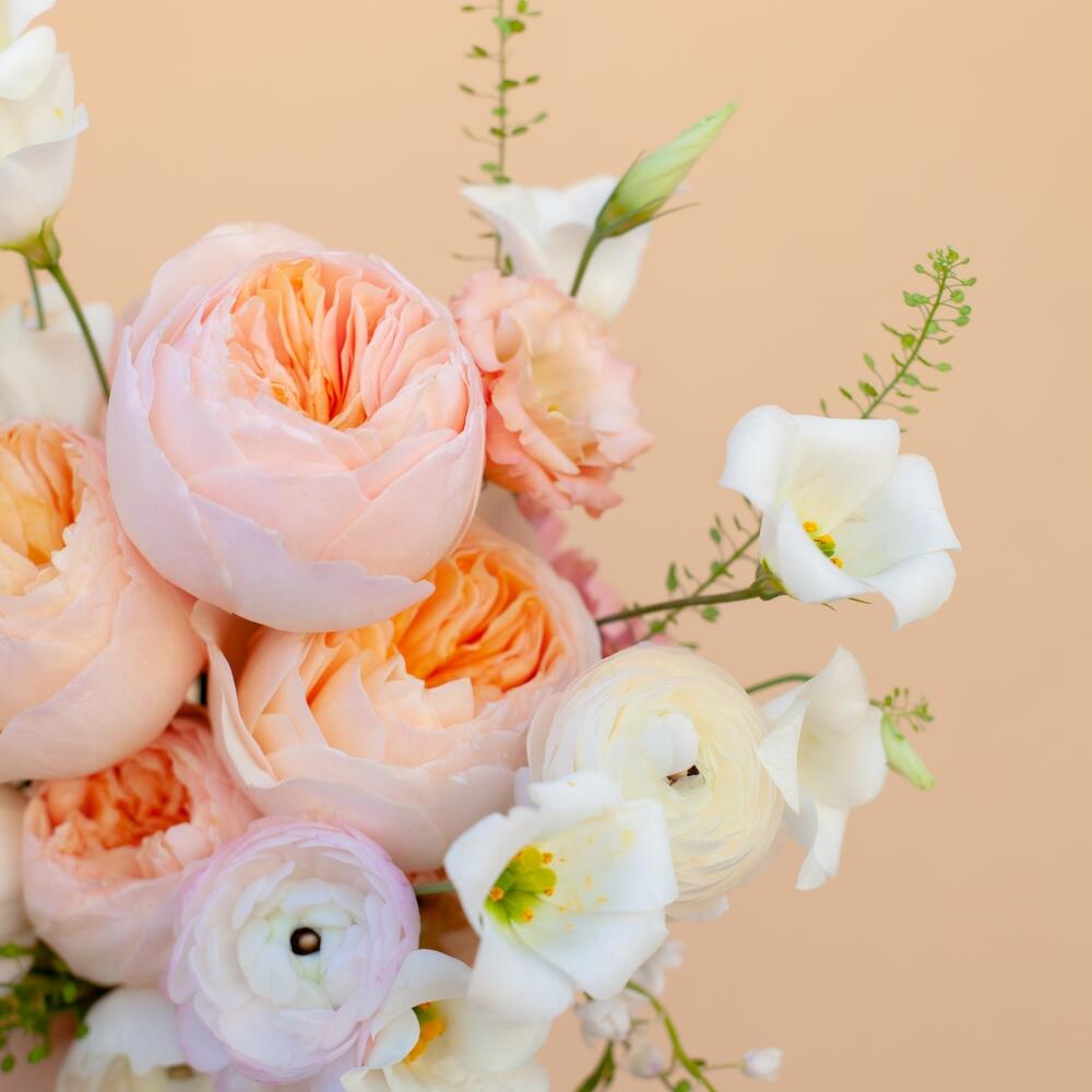 Роза джульетта дэвида остина – 5 шт.лизиантус ботаника – 1 шт.Аллиум – 3 шт.Роза кустовая – 1 шт.Лизиантус – 2 шт.Ранункулюс – 3 шт.сумку-переноска – 1 шт.ваза картонная – 1 шт.