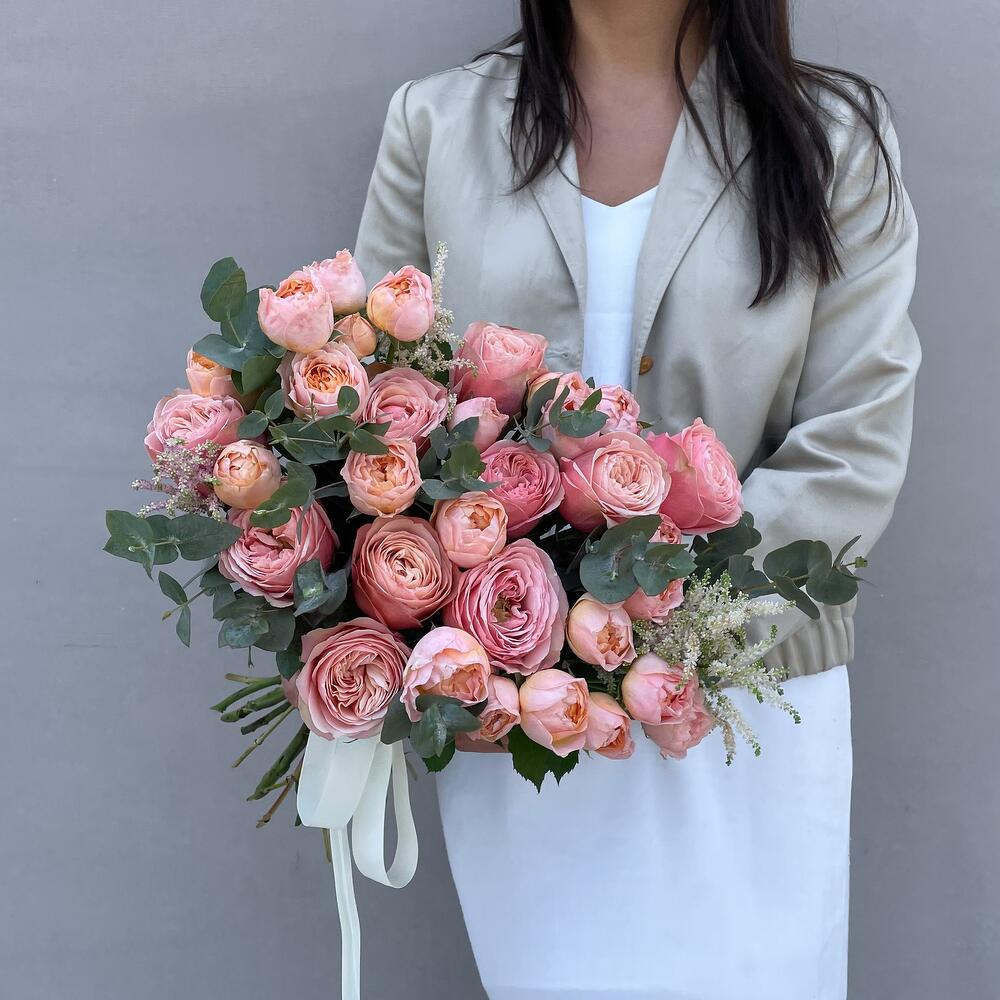 розы – 11 шт. пионовидные спрей роза – 5 шт. Астильба – 3 шт. Эвкалипт – 3 шт.