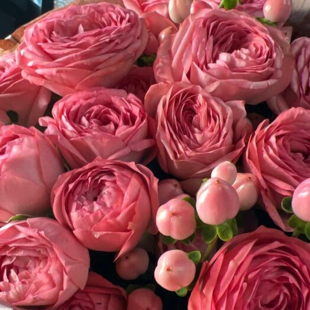 Роза кустовая пионовидная – 5 шт.Гиперикум – 3 шт.декоративная упаковка – 1 шт.Атласная лента – 1 шт.