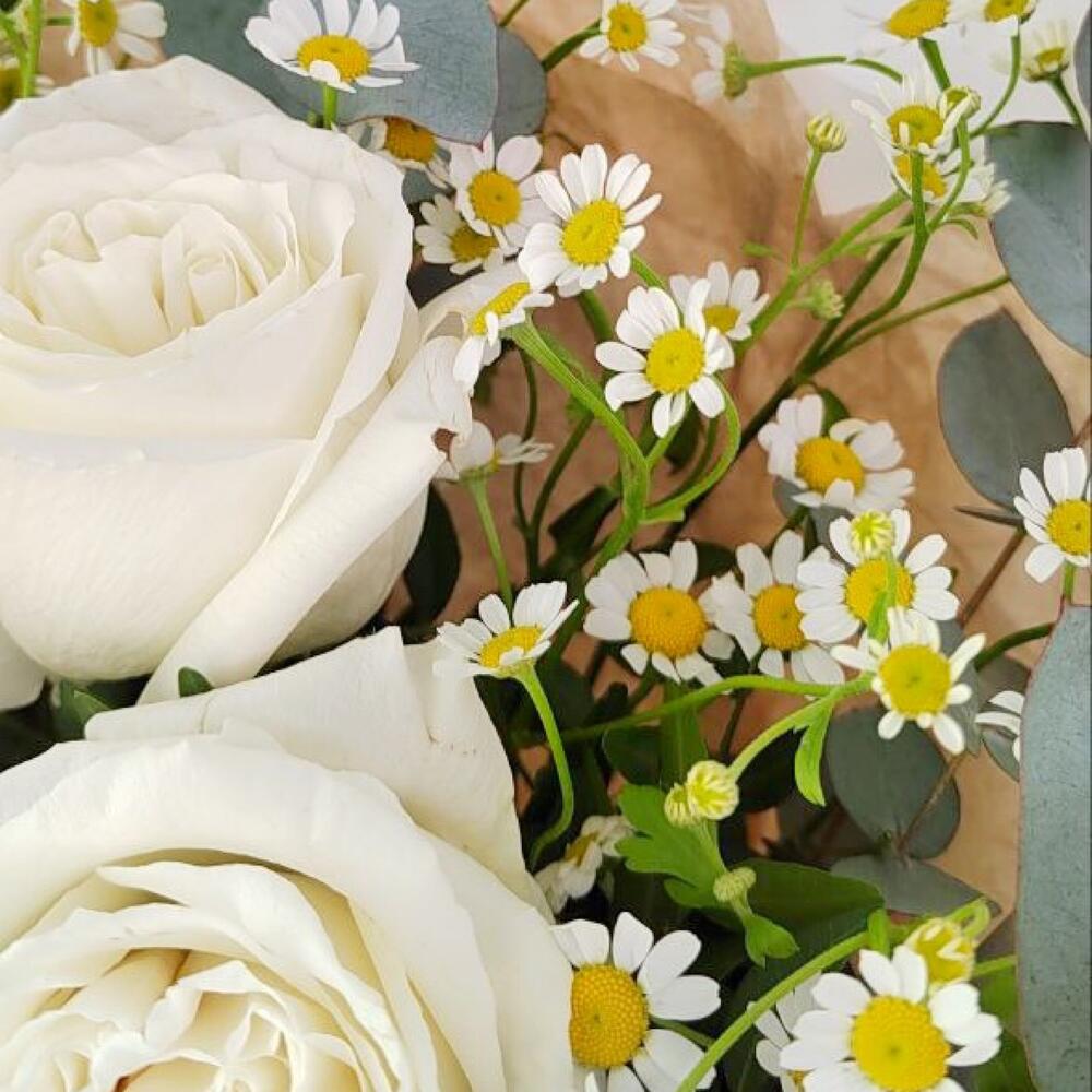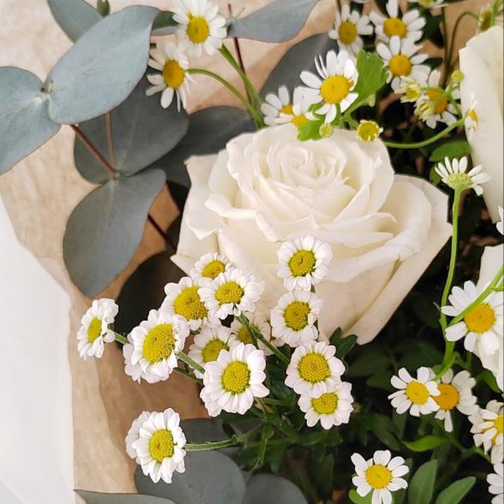 Эвкалипт – 2 шт.Ромашка кустовая – 4 шт.Упаковка дизайнерская – 4 шт.Лента атлас – 4 шт.Роза белая эквадор – 3 шт.фисташка зелень – 3 шт.