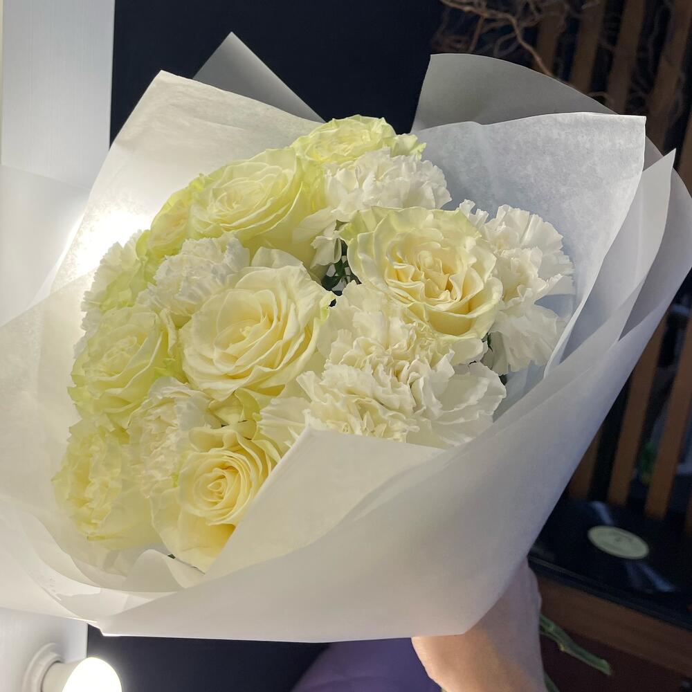 Роза Эквадор – 9 шт.Диантус белый – 8 шт.Упаковка дизайнерская – 1 шт.