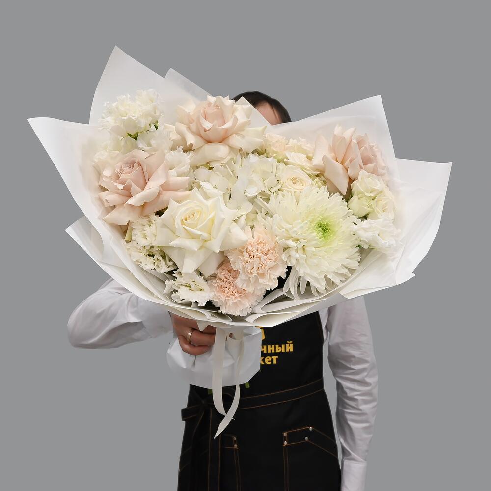 Гортензия – 1 шт.Хризантема – 1 шт.Французская роза – 4 шт.Гвоздика – 2 шт.Эустома – 2 шт.Кустовая пионовидная роза – 2 шт.