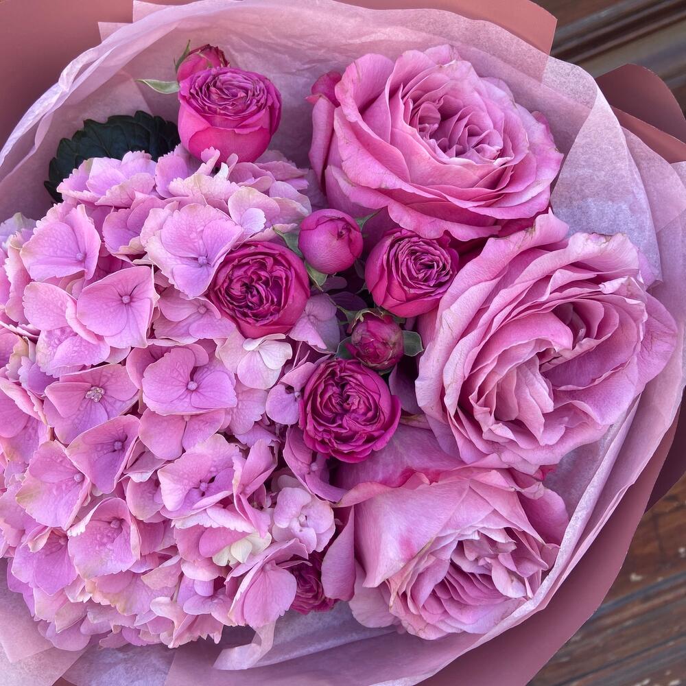 Упаковка дизайнерская – 1 шт.Гортензия розовая – 1 шт.классик сенсейшен – 1 шт.квинс краун роза – 3 шт.