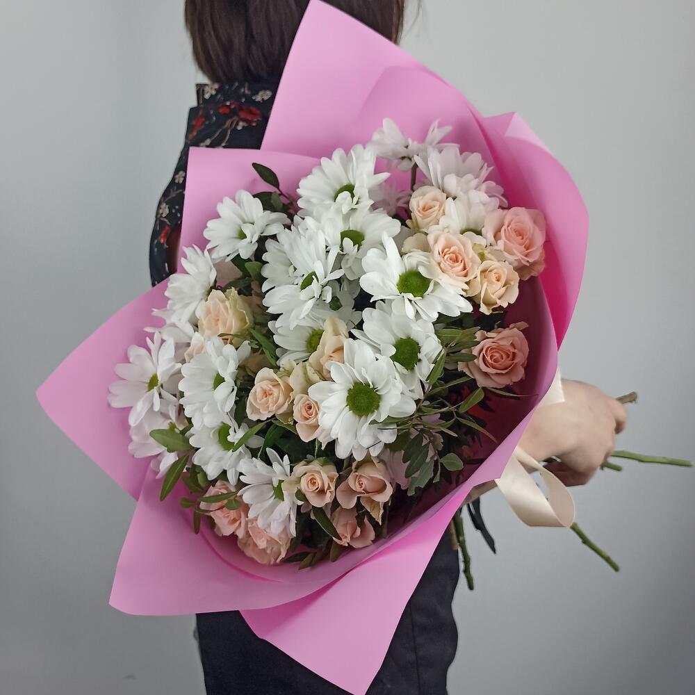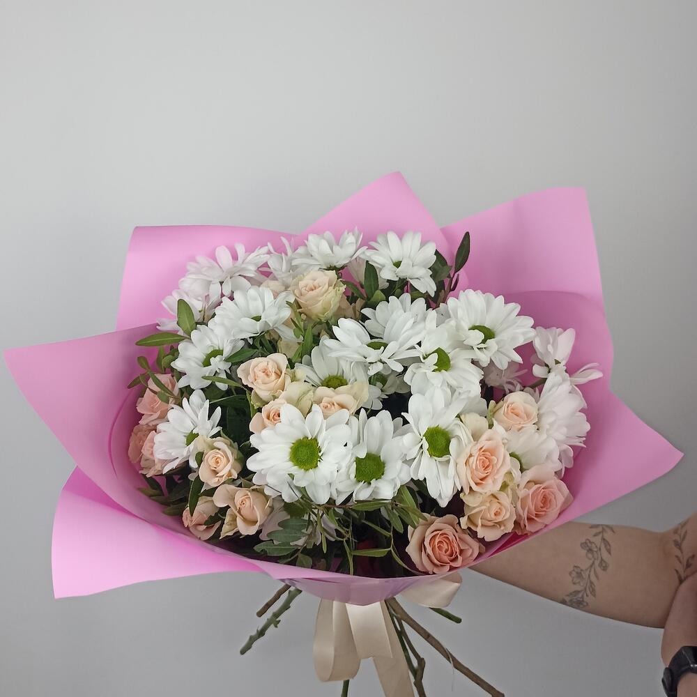 Лента – 1 шт.Роза кустовая – 4 шт.Хризантема кустовая – 5 шт.Фисташка – 3 шт.Пленка матовая – 2 шт.