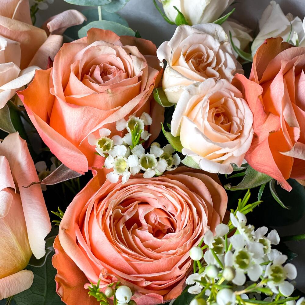 Ваксфлауэр – 2 шт.Лента – 1 шт.Роза кустовая – 2 шт.Эвкалипт – 1 шт.Роза одноголовая – 5 шт.бумага упаковочная – 2 шт.
