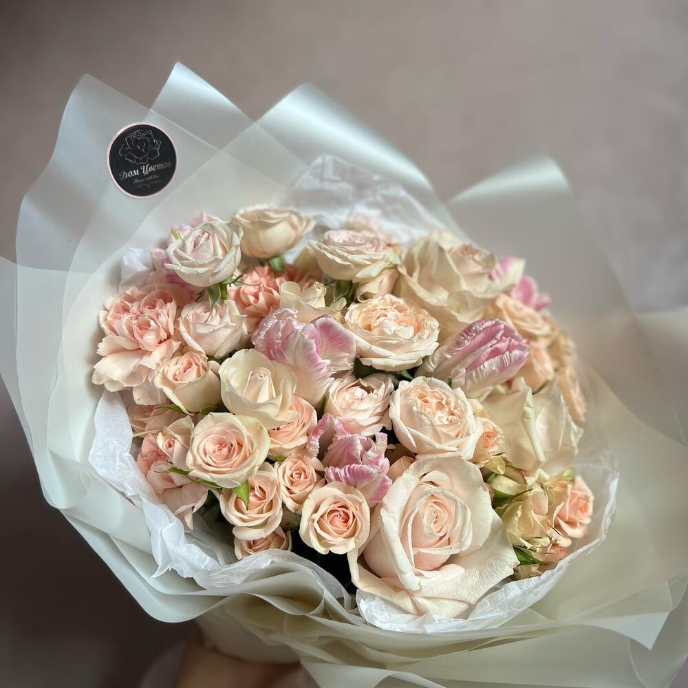 Диантус – 3 шт.Кустовая роза – 5 шт.Одноголовая роза – 3 шт.тюльпаны – 5 шт.декоративная упаковка – 1 шт.Атласная лента – 1 шт.
