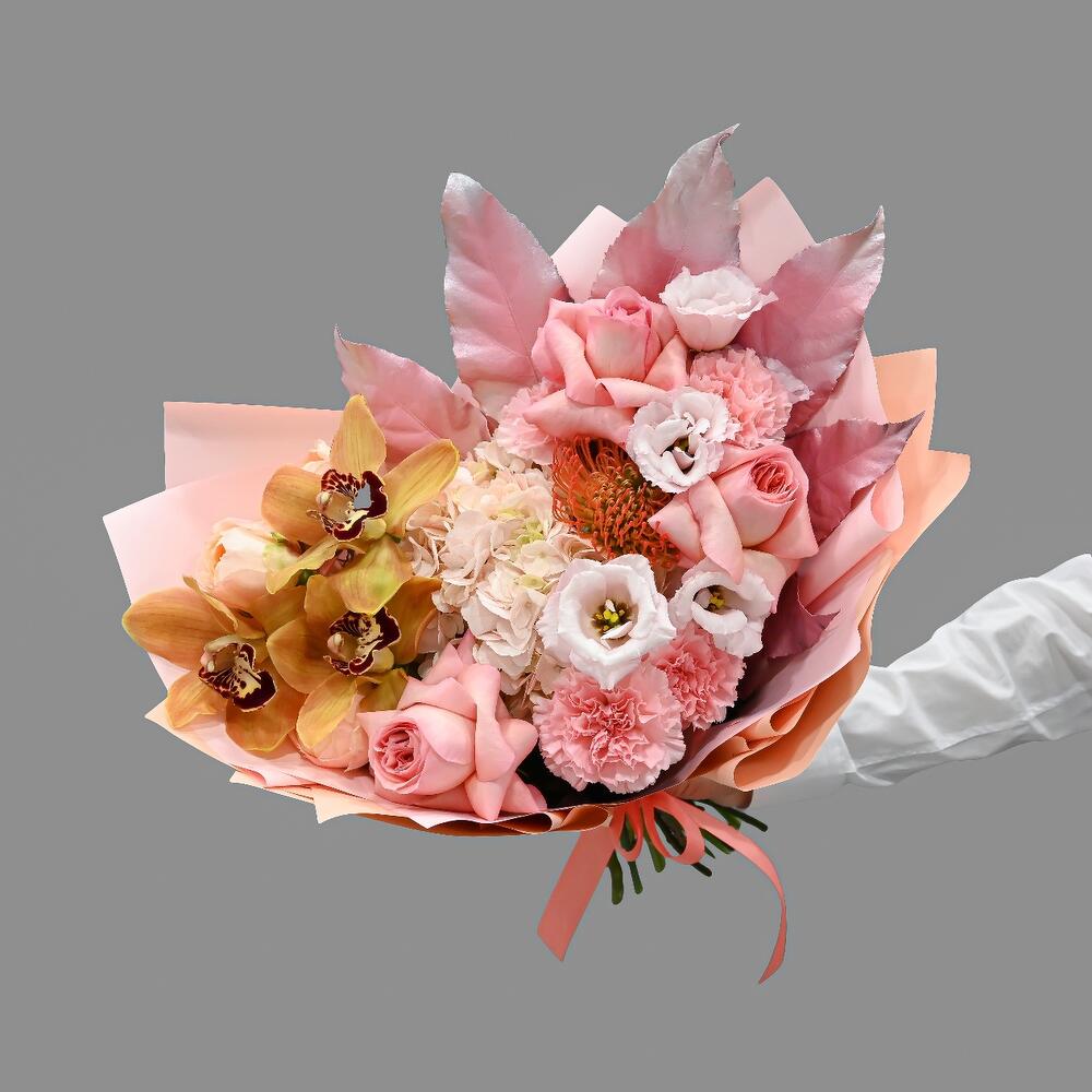 Гортензия – 1 шт.Роза пионовидная – 6 шт.Лизиантус – 1 шт.Диантус – 4 шт.левкадендрон – 1 шт.Аралия – 1 шт.Упаковка дизайнерская – 1 шт.Фисташка – 5 шт.ЦИМБИДИУМ – 3 шт.