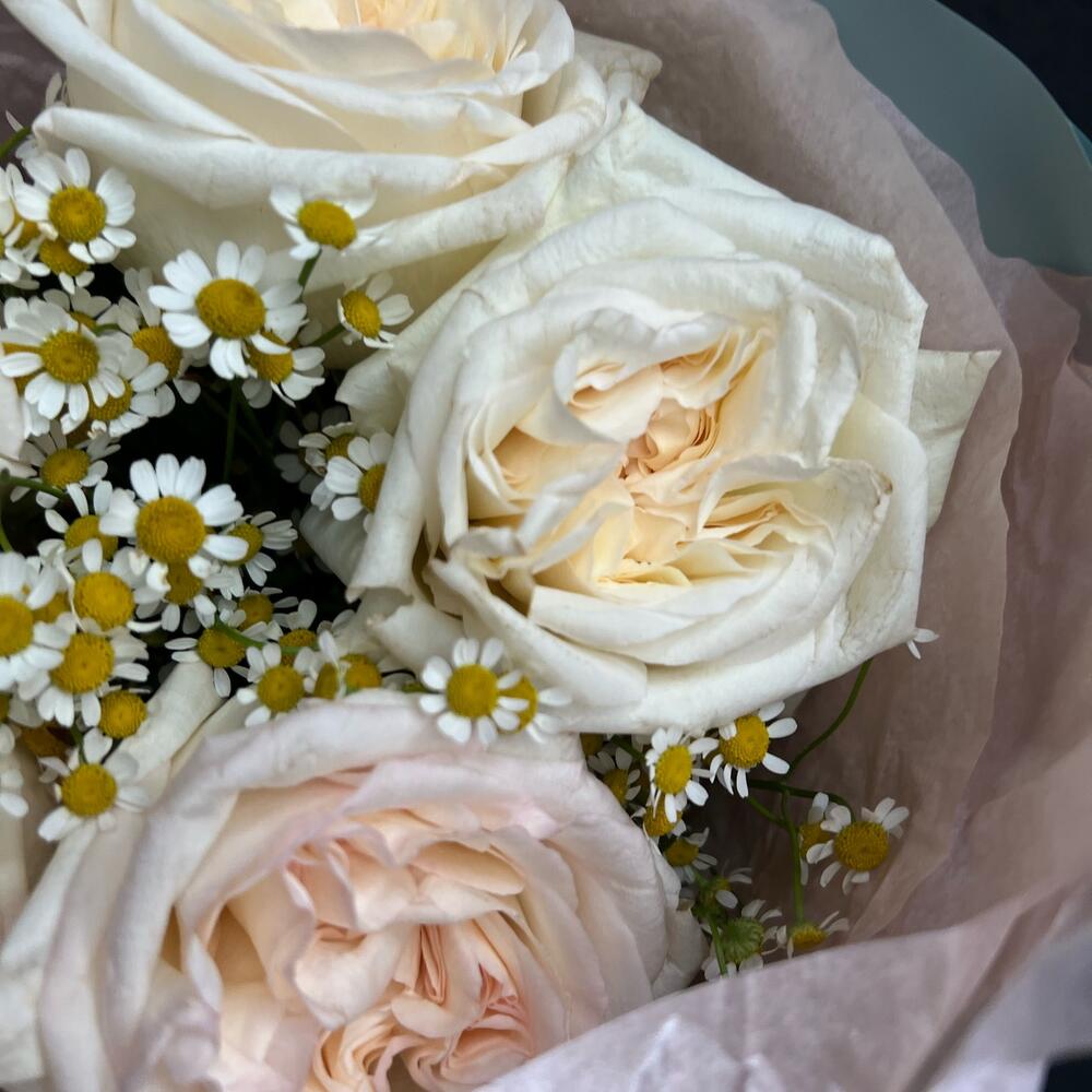 Пионовидная роза – 5 шт.Танацетум – 3 шт.декоративная упаковка – 1 шт.Атласная лента – 1 шт.