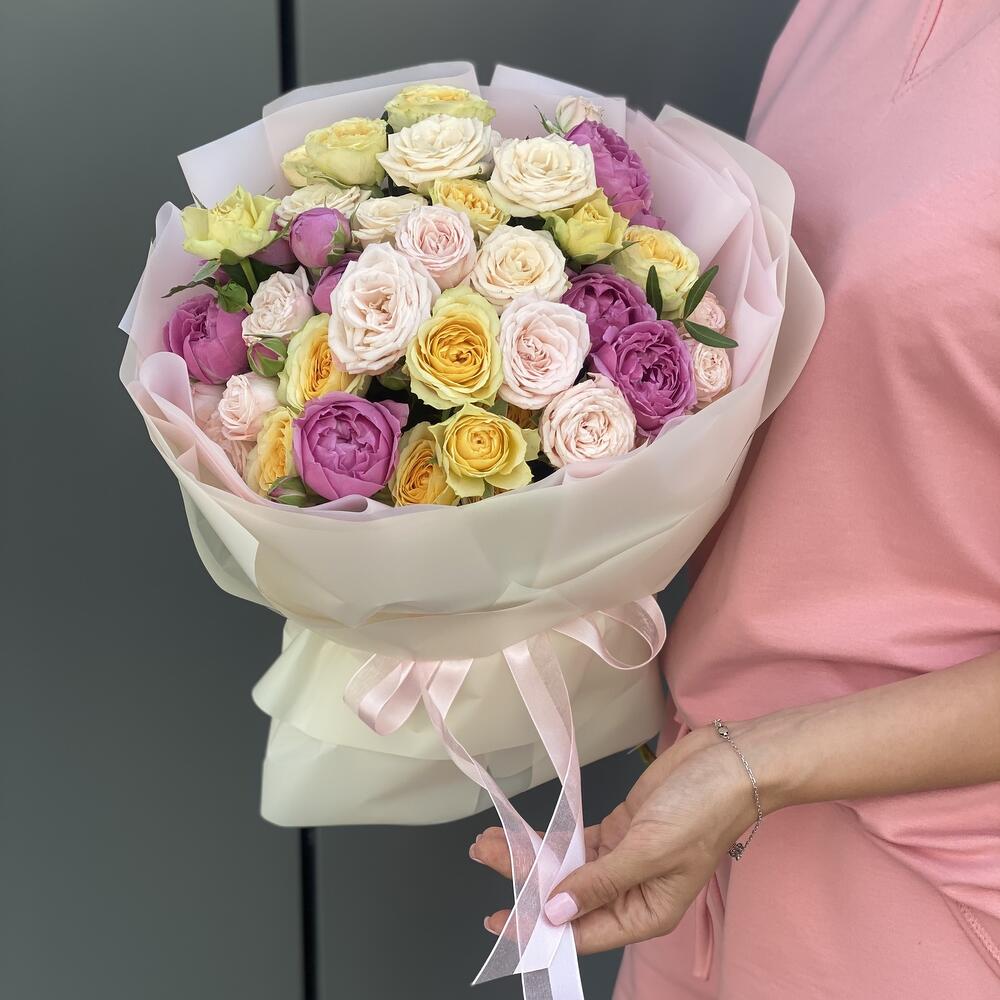 Букет Юбилейный из кустовых пионовидных роз и хризантемы