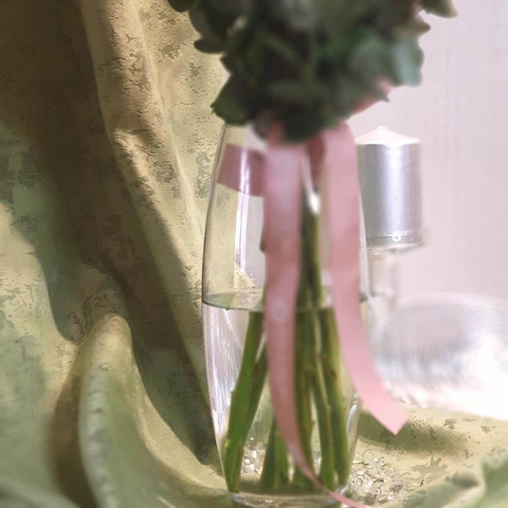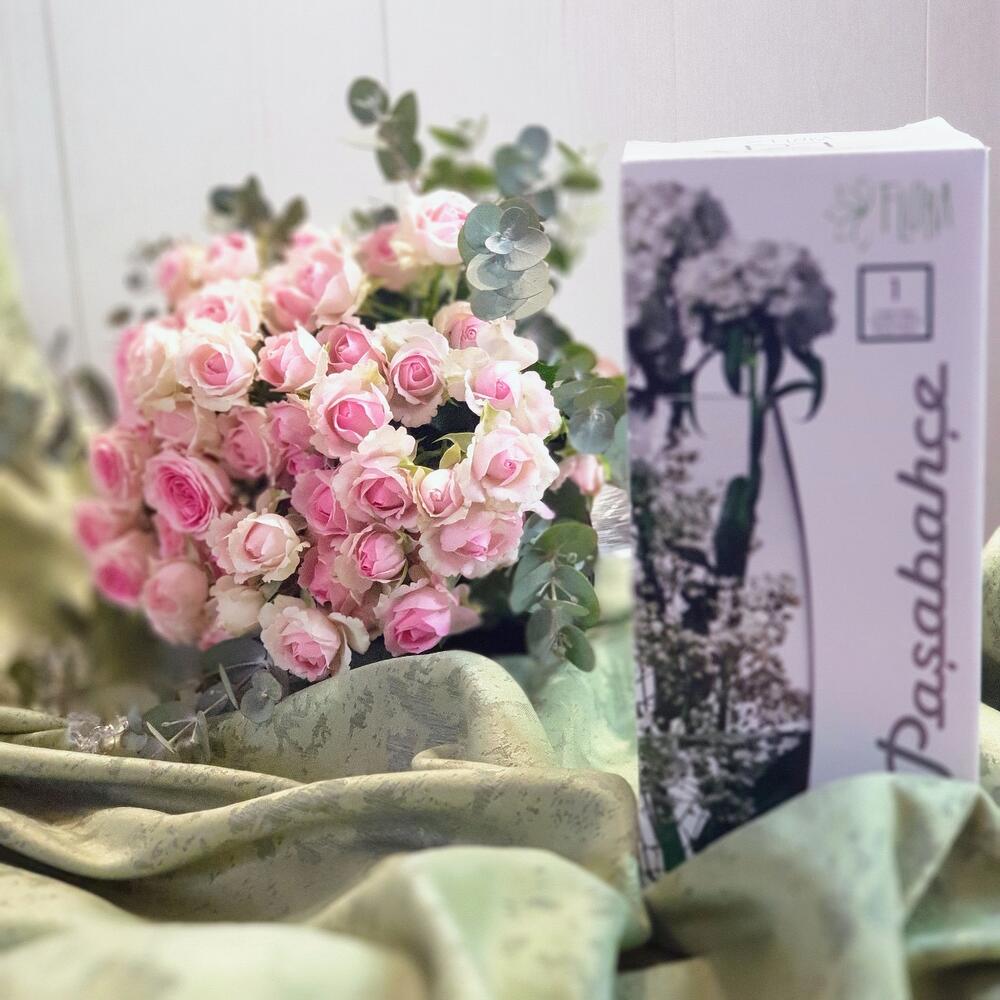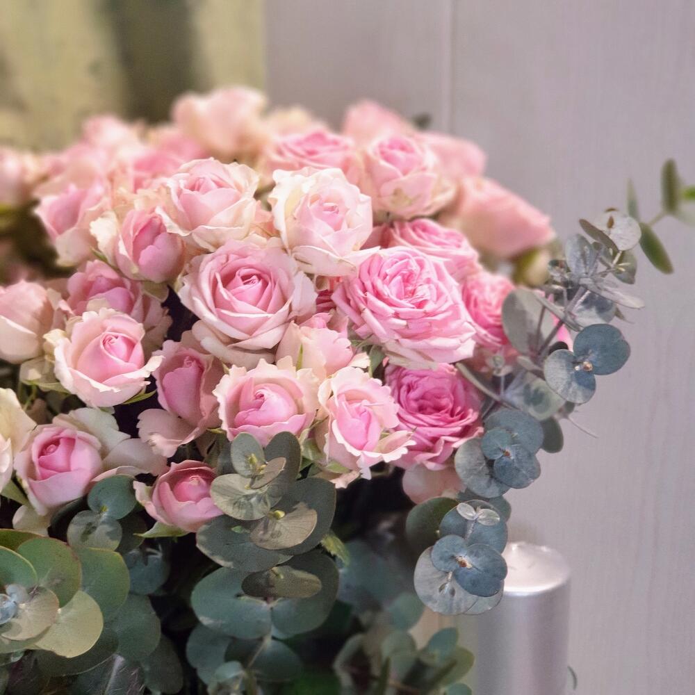 Эвкалипт – 5 шт.Лента атласная – 1 шт.Роза кустовая пионовидная – 7 шт.Пакет подарочный – 1 шт.Кризал (подкормка) – 2 шт.Ваза стеклянная – 1 шт.