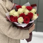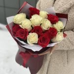 Букет из красных и белых роз в стильном оформлении!
