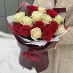 Роза красная – 8 шт. Роза белая – 7 шт. Оформление – 1 шт.