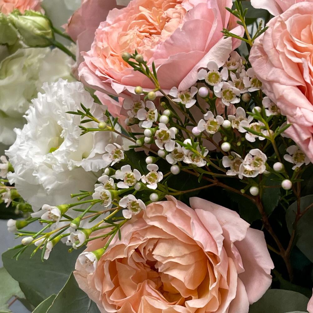 Эвкалипт – 2 шт.Лизиантус – 3 шт.Ваксфлауэр – 1 шт.Роза Джульетта – 3 шт.Коробка – 1 шт.Оазис флористический – 1 шт.