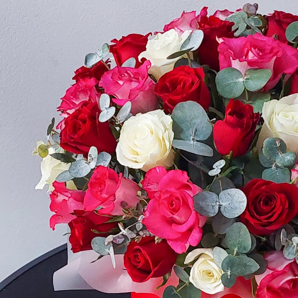 Цветы в коробке. 51роза и эвкалипт в шляпной коробке